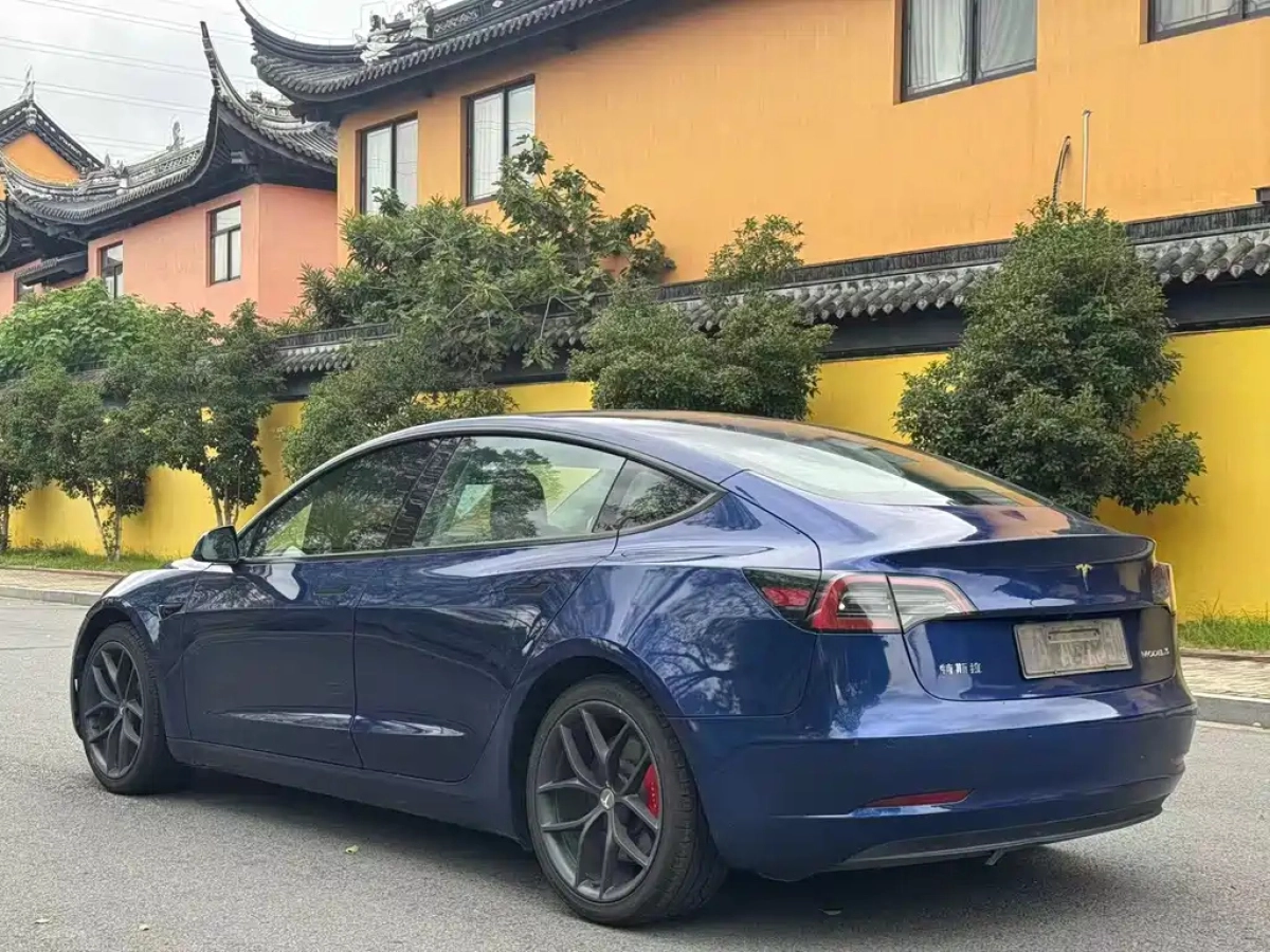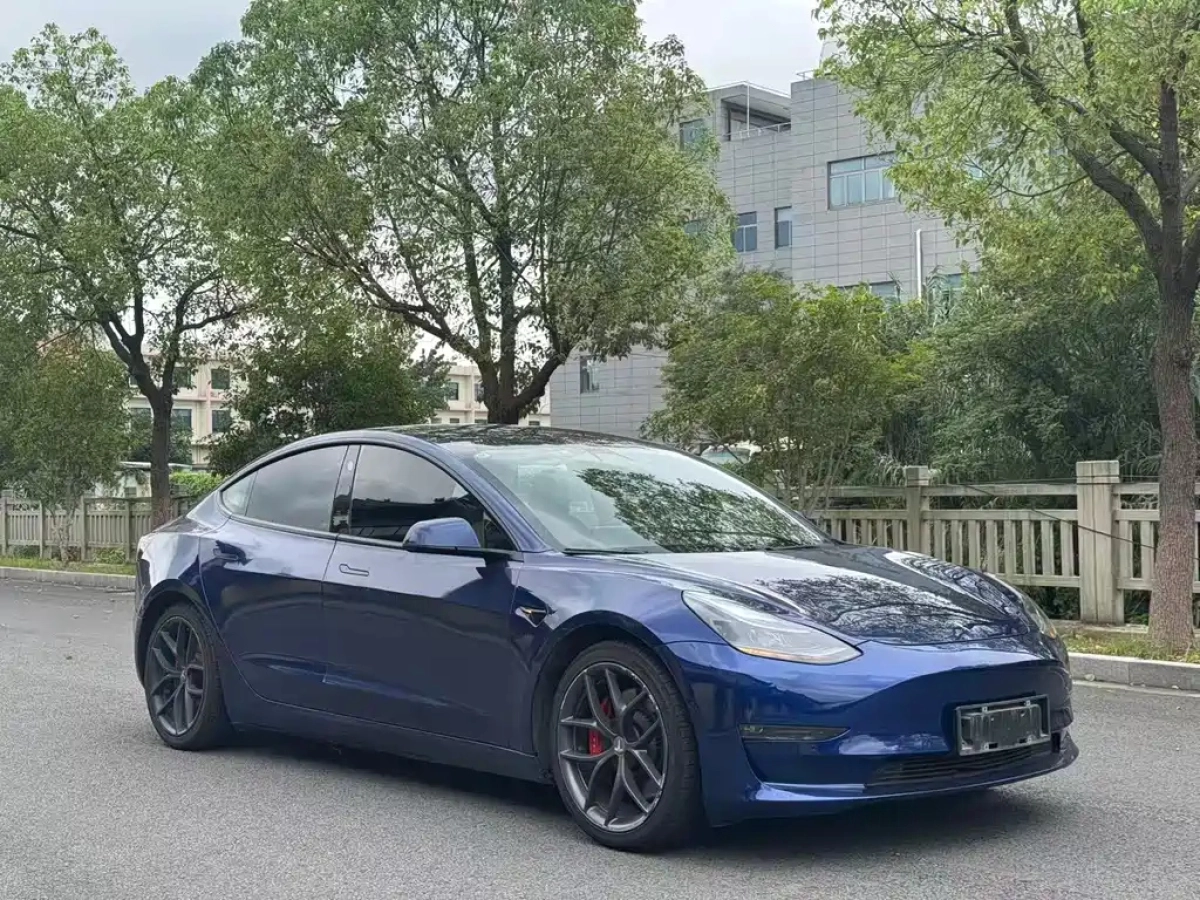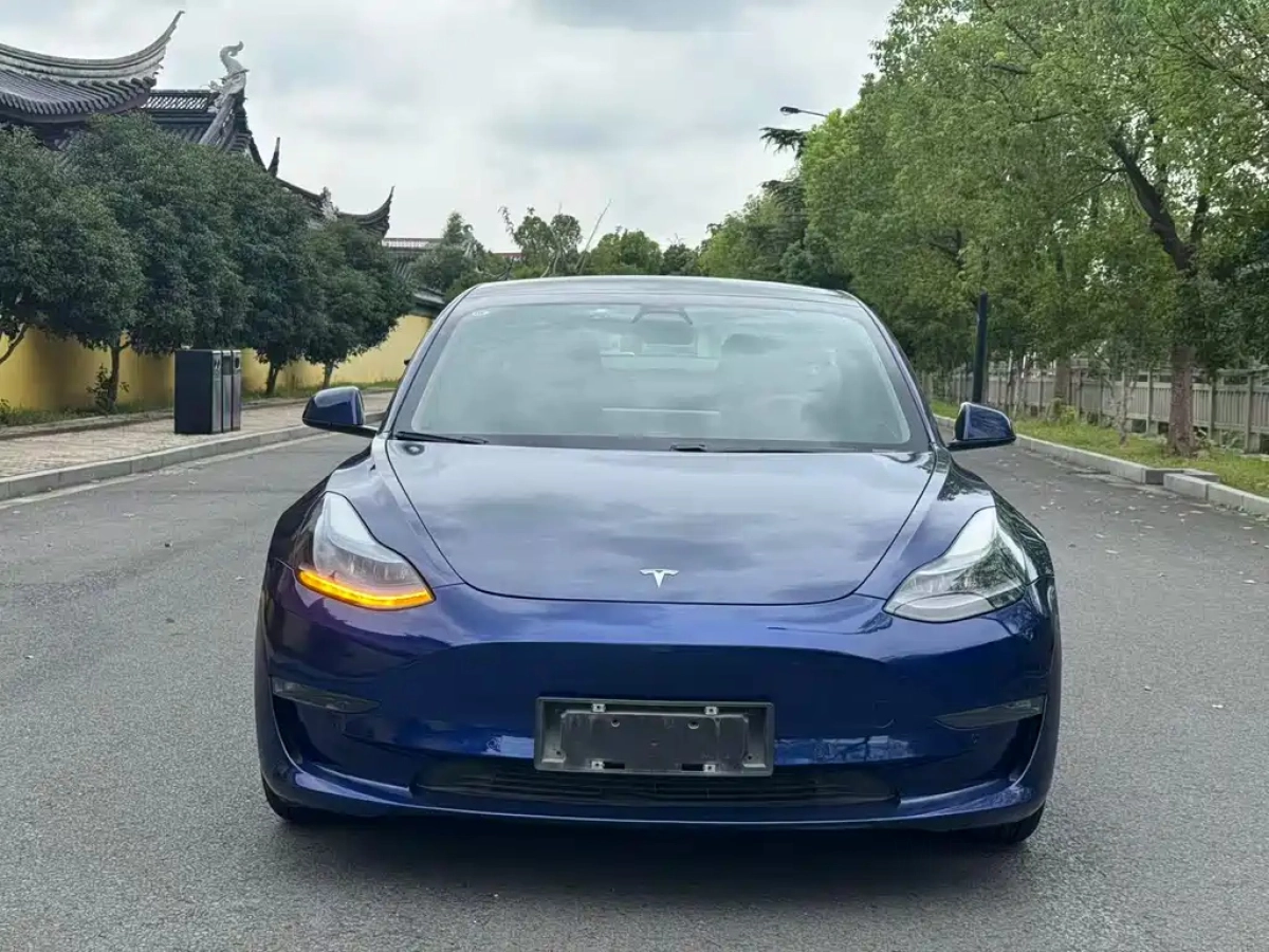 Синий ТЕСЛА МОДЕЛ 3 находится в китайском городе suzhou jiangsu