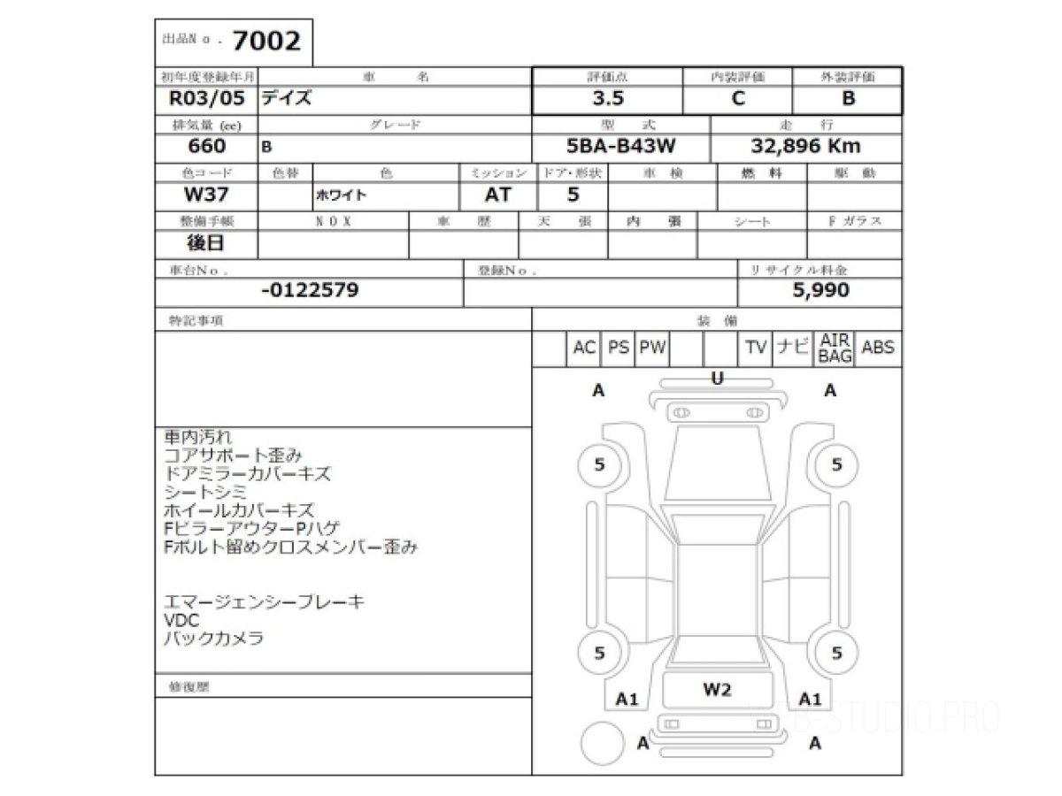 Оценка аукциона: 3.5, что гарантирует хорошее техническое и косметическое состояние кузова и салона.