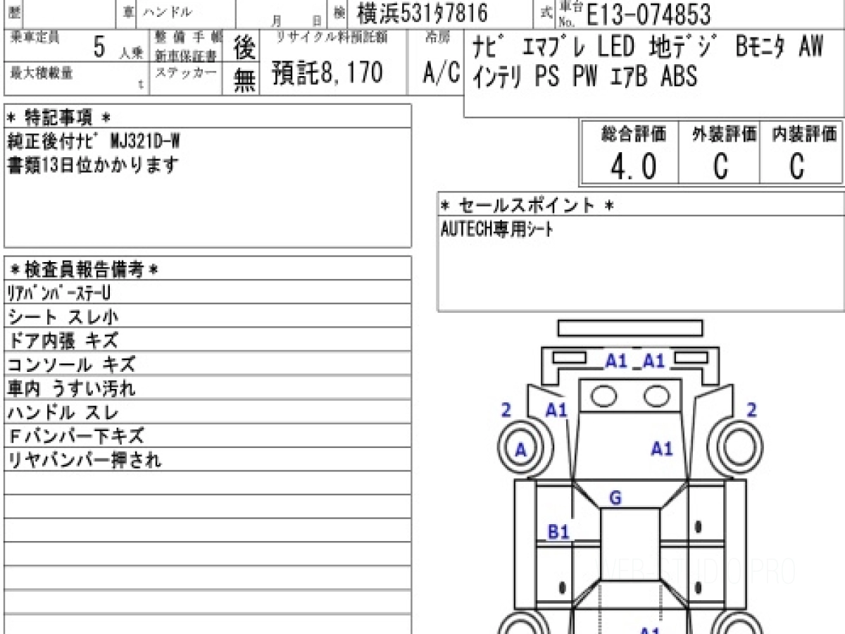 Оценка аукциона: 4, что гарантирует хорошее техническое и косметическое состояние кузова и салона.