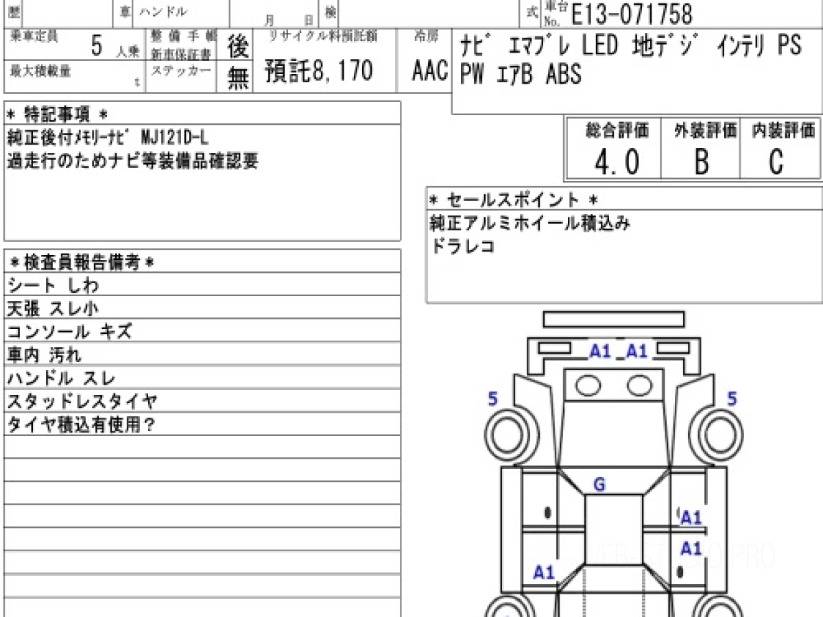 Оценка аукциона: 4, что гарантирует хорошее техническое и косметическое состояние кузова и салона.