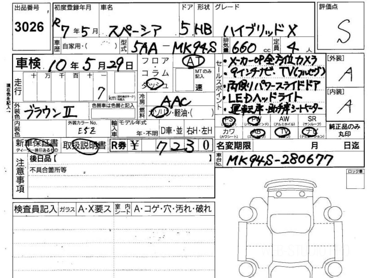 Оценка аукциона: S, что гарантирует хорошее техническое и косметическое состояние кузова и салона.