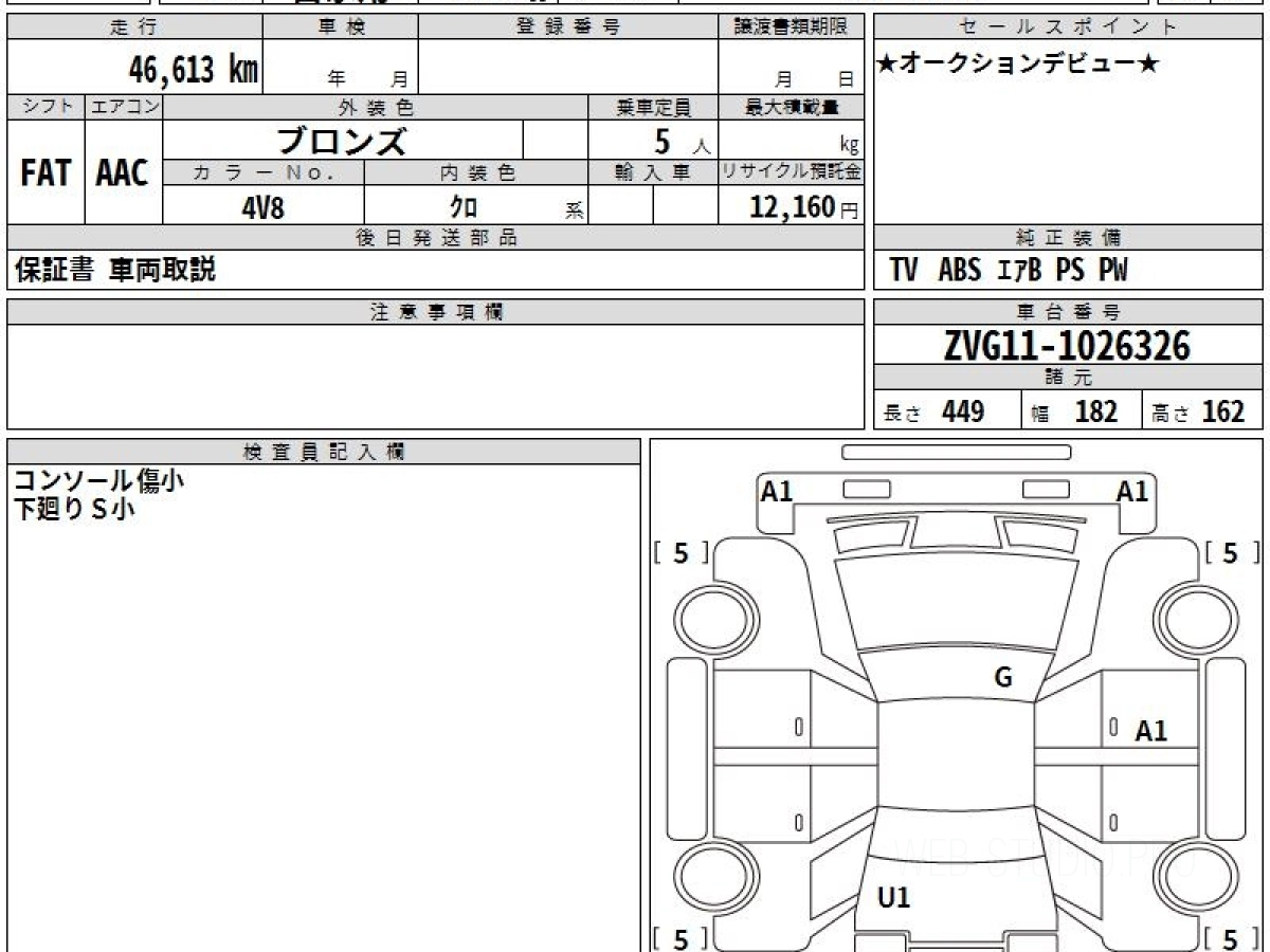 Оценка аукциона: 5, что гарантирует хорошее техническое и косметическое состояние кузова и салона.