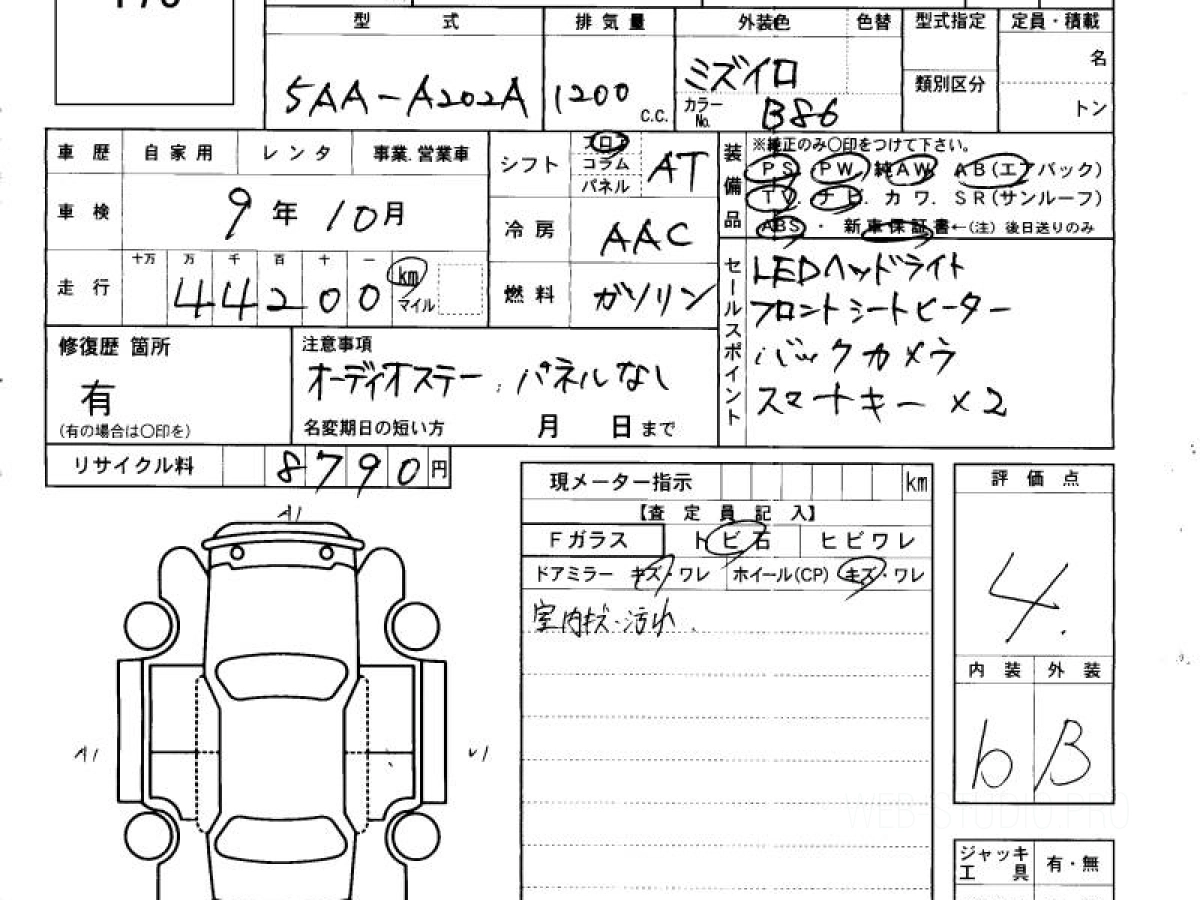 Оценка аукциона: 4, что гарантирует хорошее техническое и косметическое состояние кузова и салона.